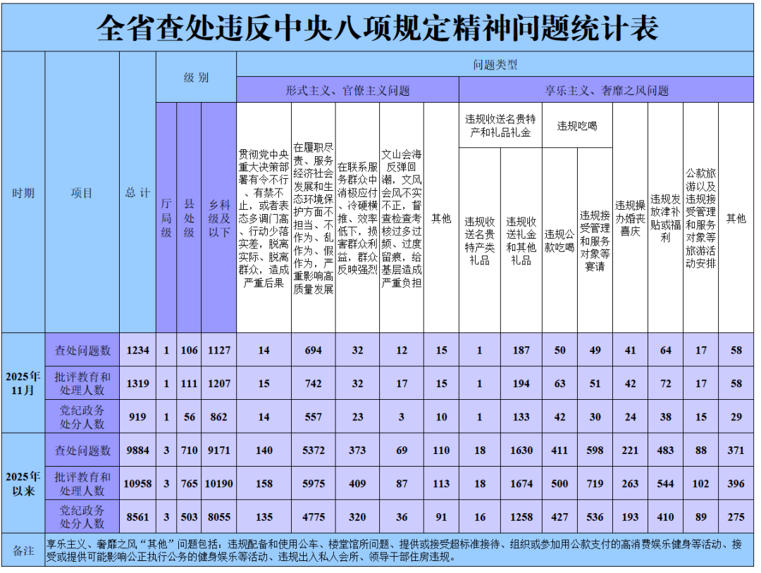 2025年11月,黑龙江省纪检监察机关共查处违反中央八项规定精神问题1234起,批评教育和处理1319人,其中党纪政务处分919人。